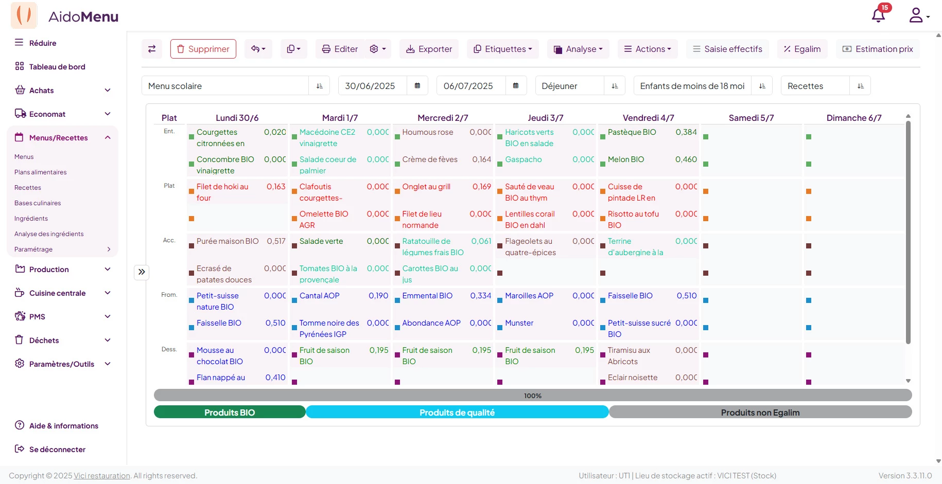 Planifiez vos menus, gérez vos stocks, automatisez vos commandes fournisseurs et pilotez votre budget, dans le respect de la loi EGAlim et des recommandations GEMRCN.