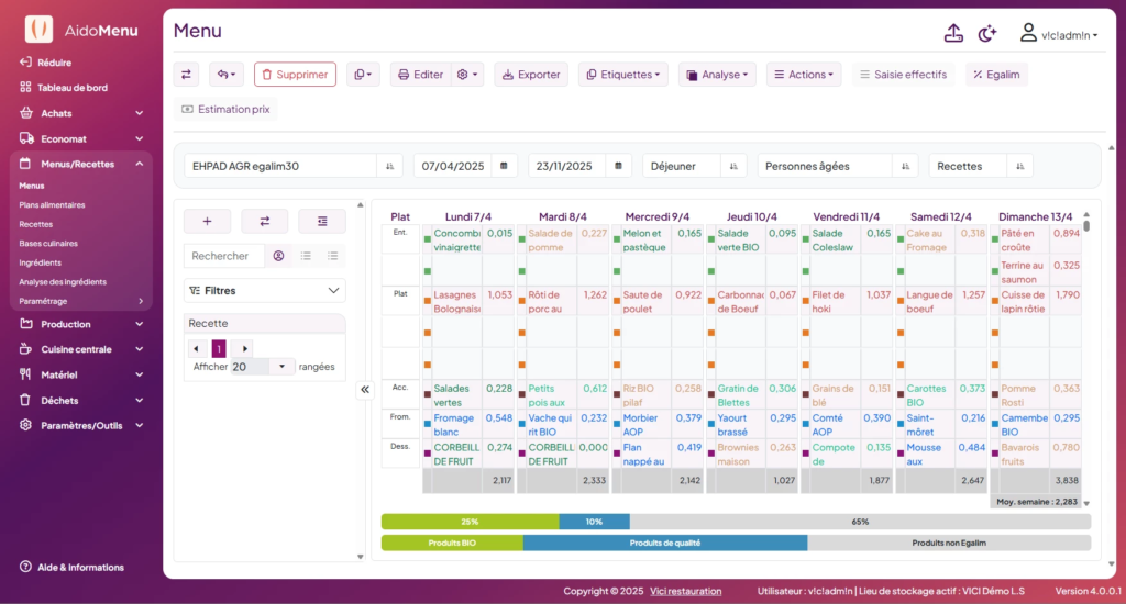 Avec le module Menu et Recette d’AidoMenu, créez des menus sains, savoureux et conformes à la loi EGalim en toute simplicité ! Suivez également vos coûts de revient à la journée, au menu, par période, pour une gestion budgétaire optimale et respectueuse des exigences réglementaires.